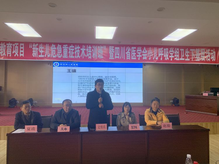 阿坝州人民医院副院长文传兵开班讲话,文院长首先感谢远道而来的专家们。其次文院长指出:此次培训班围绕母婴安全及新生儿死亡评审中存在的问题进行。要求大家充分认识举办母婴安全技术培训班的重要意义。对儿科和妇产科近几年的成功救治及工作业绩做出了肯定。并期望夏主任能够带领全州的儿科事业更上台阶。最后,文院长再次感谢艾主任等专家一行莅临州人民医院带来精彩的演讲和指导。