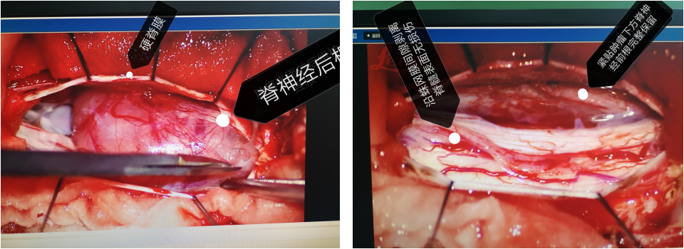 术中沿肿瘤与蛛网膜间隙显微器械下剥离,采用沿肿瘤测小心尽量分离,神经根部分神经穿过肿瘤,行囊内分块切除尽可能保留神经根。术中尽量保存了蛛网膜完整性,对脊髓无创性。