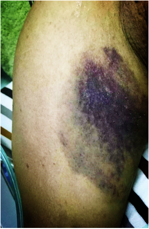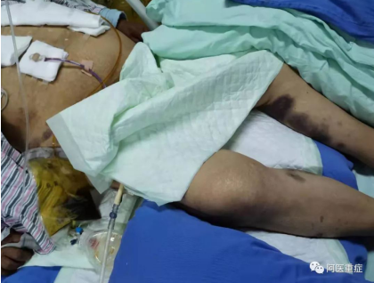 (上图:患者因凝血功能紊乱、严重感染后低血小板引起右上臂皮下出现大片瘀斑。)