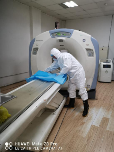 一是接到发热病例通知后,技师迅速穿戴防护用品,先通知读片医师准备读片,待穿好防护用品后再通知预检分诊带病人到CT1检查;二是技师给予检查;三是检查完后告知患者不需要拿结果,将病人护送出检查室。然后给设备消毒,脱掉防护用品。四是读片医师先电话告知发热门诊医生,确定疑似病例。