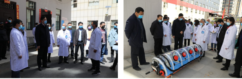 在隔离病区前,宋主任询问了罗俊主任治疗全州唯一一名新冠肺炎确诊患者的心得体会,关心了中西医结合治疗的效果并现场查看了负压担架的使用。