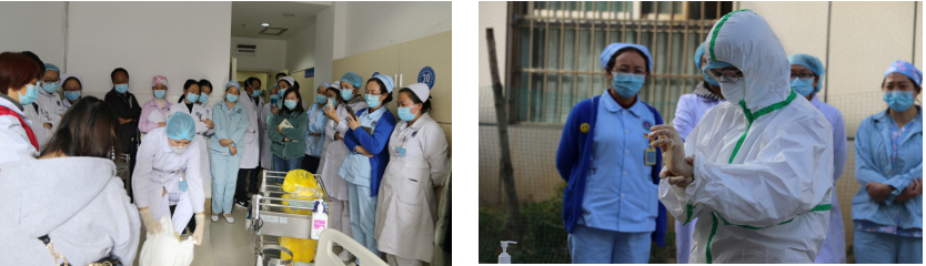 下午4点01分演练正式开始。演练中,呼吸内科模拟了病区内分别发现一例新冠肺炎疑似病例,依据阿坝州人民医院新冠肺炎医疗救治与疫情防控领导小组制定的流程及操作规程,医护人员严格按照流程完成了从发现、上报、隔离、转运到个人防护、医疗废物处置及终末消毒等各项工作,演练过程完整、应急组织规范,人员职责清晰,达到了预期效果。