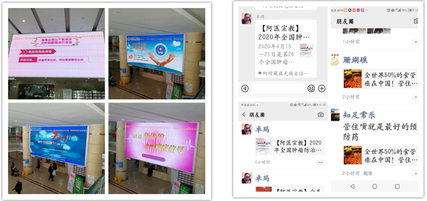 活动期间,通过微信、门诊大厅LED屏、宣传栏、宣传展板、发放宣传单、门诊大厅和候诊区等处张贴海报等形式,宣传癌症防治核心信息及知识要点。