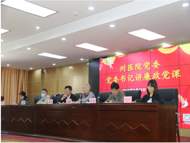 院长谷运麒在廉政党课上首先通报了中央省州纪委全会报告中对全国、全省、全州纪检工作中处置的案例及相关数据,强调各级部门增强危机意识,坚持对各类腐败无禁区、全覆盖、零容忍,坚持重遏制、强高压、长震慑,全覆盖、零容忍的决心。随后他指出了医院在廉政建设工作中存在的问题,一是廉政意识有待加强,二是“一岗双责”落实不到位,三是纪律意识有待加强,四是制度、机制、流程不够完善。为进一步扎实推进党风廉政建设和反腐败斗争工作,医院一是要加强学习和教育,筑牢廉政的底线思维,二是要构建一体化推进“不敢腐、不能腐、不想腐”的长效工作机制。三是要将院党委2020年党风廉政计划不折不扣地完成好。党课最后,院长谷运麒传达并带领全体参会人员一起学习了《关于2020年纠正医药购销领域和医疗服务中不正之风工作要点的通知》文件精神,并对文件中医院工作进行了解析和安排。