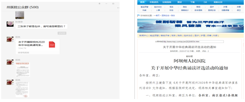 按照州卫健委下发《关于开展阿坝州2020年中华经典诵写讲演系列活动》的通知精神,州人民医院高度重视,7月2日下发文件由医院事业发展部牵头,组织各科室、各病区认真落实此次经典诵读活动,截至7月13日共收到视频作品11个,视频作品类别有古诗词经典、疫情防控和现代诗歌朗诵