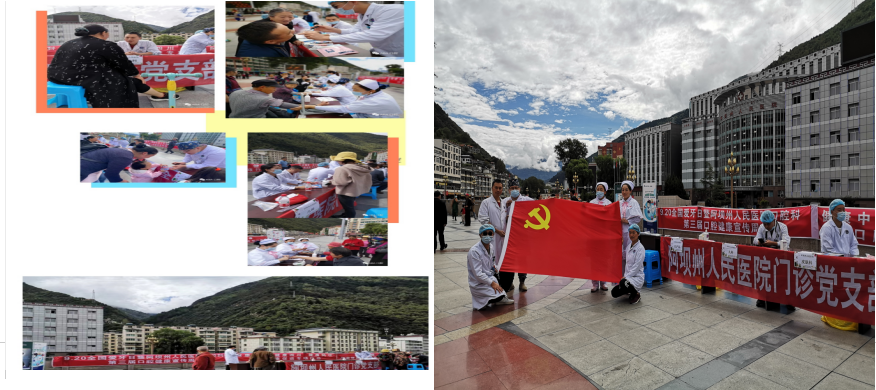 2020年9月20日上午,州人民医院门诊第三党支部在九州广场举行“迎国庆 送健康”义诊活动,此次义诊联合口腔科“920爱牙日暨第三届口腔科口腔健康教育宣传周义诊活动”、“健康中国 健康四川 健康阿坝 口腔健康促进专项行动”、“阿坝州人民医院 南丁格尔服务队义诊活动”一起举办。活动由支部书记林洪、宣传统战委员张志强带队,全体党员同志参加。
