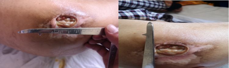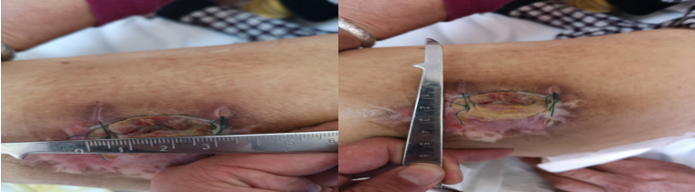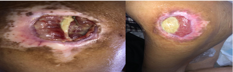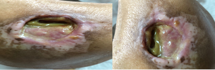 右侧压疮:肉眼组织覆盖髂胫束,创面范围明显缩小。