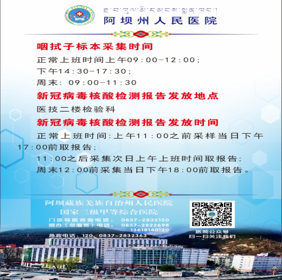 阿坝州人民医院是阿坝州新型冠状病毒核酸检测资质单位,7月起,开展核酸检测服务。近期,疫情防控进入非常时期,核酸检测需求量大增。阿坝州人民医院勇担责任,整体部署,科学施策,做到应检尽检,愿检尽检。
