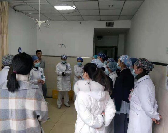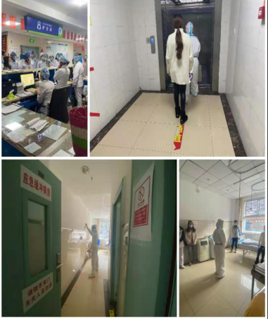演练模拟病例:病区患者27床王林,女,56岁,于2021年1月23日入院,入院咽拭子结果为阴性,当时患者及家属隐瞒来自石家庄某市高危地区,因持续发烧,症状明显,2021-1-24主管医生再次追问下患者及家属告知来自高危地区,主管医生再次下医嘱采集咽拭子,由白班总务护士打印条码取样,送检。于2021-1-25下午16:30接检验科电话报告内三科27床患者王林咽拭子报告阳性。按照内三科科主任安排,立即按照应急预案开展工作。参加本次演练的护理部、各科室护士长、带教老师及内三科全体医护人员,共计30余人。