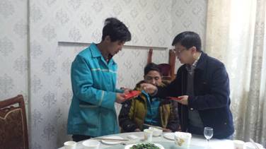我院为精准扶贫帮扶村贫困户设立了公益性岗位,聘请帮扶平困户适龄人员3人到我院从事保安保洁工作。2016年11月他们来到我院开始工作,医院解决了他们的住宿,并在生活上尽量给予照顾。2017年春节即将来临,医院杨林副院长代表医院党政领导班子开展了慰问,祝愿他们新年快乐,且通过他们转达了对他们及其他贫困户表示了节日问候,并送上慰问金。