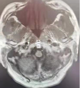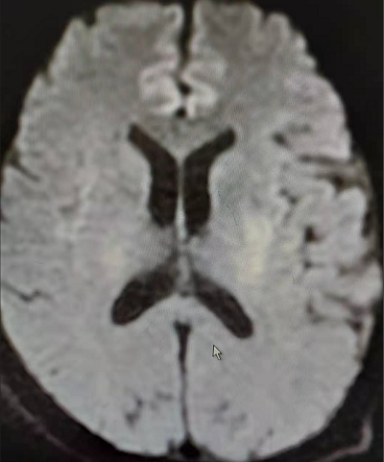在溶栓治疗1个小时后,患者口齿逐渐清楚,右侧肢体肌力逐渐恢复;3个小时后,及时行MRI-头部扫描。扫描结果显示:左侧脑室体部旁、左侧基底节区急性缺血缺氧脑损伤,左侧大脑中动脉M3段起始处局部变窄。扫描结果坚定了医护人员的信心。在溶栓治疗24小时后,再次复查颅脑CT,并将结果与溶栓3+小时颅脑MRI片进行了比较,显示:颅脑左侧基底节豆状核提示脑梗塞。针对对比结果,继续跟进后期治疗方案。经过系列治疗,患者右侧肢体肌力已基本恢复,约Ⅴ-级,无言语障碍,无头晕、头痛等不适,转入内一科普通病房观察治疗。