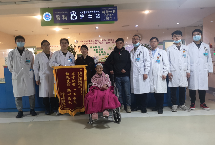 老阿妈在康复出院当天,对阿坝州人民医院神经外科团队表示万分感谢,送上一面艳丽的锦旗代表对神经外科医疗技术水平的肯定。这群可爱的白衣天使会在阿坝州这片美丽的土地上不断前行,秉承“以病人为中心、为人民服务”的理念,坚守在疾病第一线,守护阿坝州人民的健康!