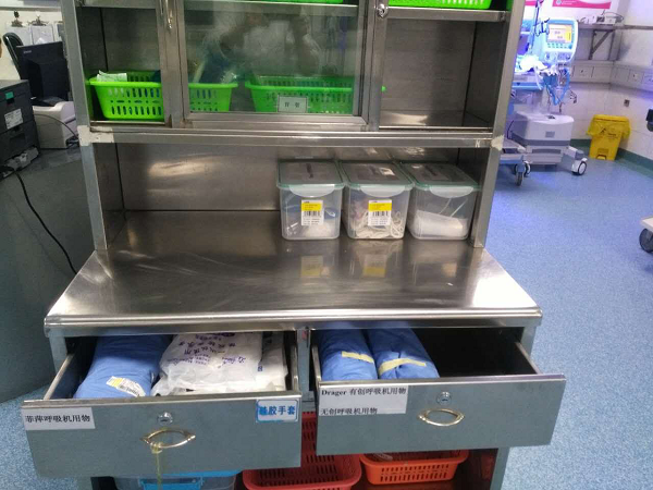 培训结束后,为更加有效、快捷使用呼吸机、提高医务人员急诊急救时的效率,在儿科护士长王曦的提议下,将三种不同类型的呼吸机用物进行了分类放置,并予以醒目标识,保障医疗安全质量,规避医疗风险。