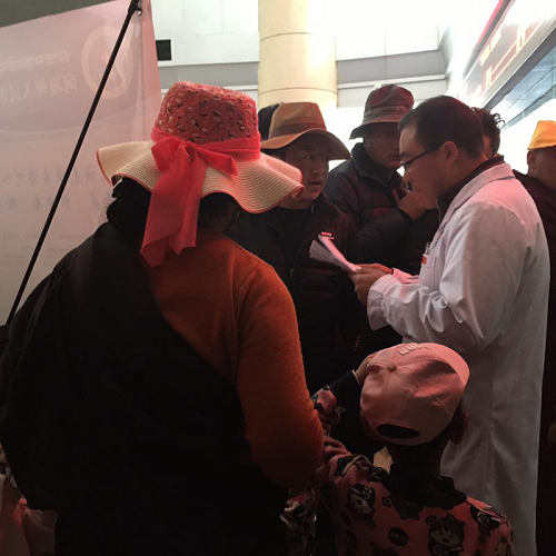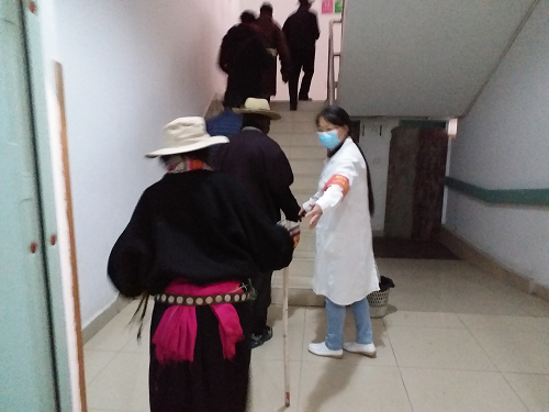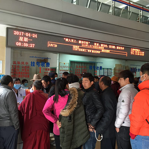 2015年阿坝州人民医院医疗服务能力大幅度提升,创建成为川甘青结合部唯一一所三级甲等医院后,吸引了马尔康及周边县城、川甘青结合部县城的病患前来就医,2016年门诊人次提高较快。在门诊大厅、各诊断室由于面积较小、病患较多,比较拥挤;年老及行动不便、语言不通患者就医时有困难。为缓解就诊高峰挂号压力,医院采取了多项便民措施。在门诊大厅安排双语护士1名,聘请双语导医5名成立导医咨询室、设置预检分诊台及时分流帮助病人。在最为繁忙的每周一上午,由医院全体党员组成的党员志愿者服务队队员们轮流在病人就医高峰时段到门诊大厅、各诊断室、各病区帮助病员、维持秩序、分流就诊患者。