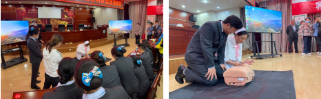 19:00,在市农行马行长的主持下,活动正式开始。服务队队员以鲜活的例子,娓娓地向全场员工讲解了急性胸痛的处理流程,院外心脏骤停的紧急处理。另一队员用精而准的操作对心肺复苏各环节技术和流程进行了现场示范。在实际操作的互动环节,职工们积极踊跃地到人体模型前进行现场演练,龙老师在一旁耐心指导,直到职工们正确完成每一个救护工作。