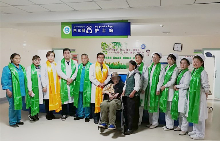 4月10日,内三科医护也收到了一位来自我州红原县麦洼乡洞拉村患者送来的哈达,患者同样以这种特别的方式由衷地表达了对科室医护的赞扬之情。