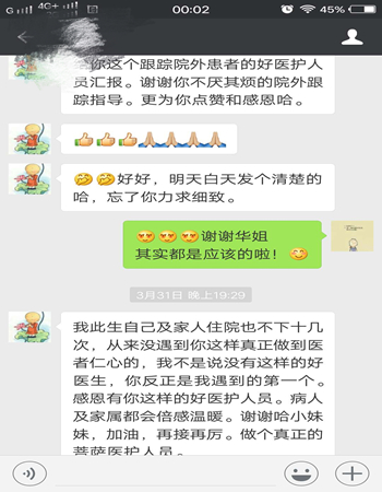 2月5日伤口造口小组再次对伤口评估:骶尾部4cmx4cm的创面、潜行12点---3点1cm、 窦道12点0.5cm、100%红色组织、伤口愈合情况好。病员于2月9日出院。出院后进行5次电话微信随访,指导其换药方法。伤口于3月底顺利痊愈。患者家属通过微信发来感谢信感谢帮助过她的所有医务人员。