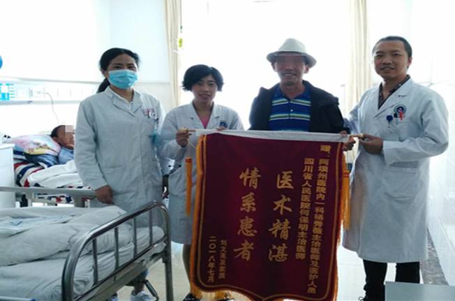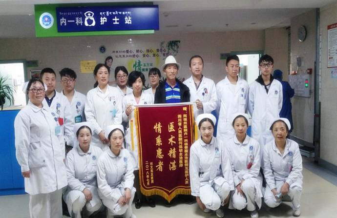 7月16日上午,阿坝州人民内一科病区温馨的一幕,患者刘大叔和家属手捧一面写着:“医术精湛,情系患者”字样的锦旗送到主管医生杨秀薇手中,并再三感谢内一科主任康乐斯基、主治医生杨秀薇、省医院对口支援医生何保明老师及科室全体医护人员对他的精心诊治和贴心护理,让他所患重疾而得到了康复。