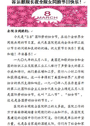 3月8日谷运麒院长医院内部局域网上发表了热情洋溢的节日贺词,向全院女同胞表示了最热烈的祝贺,肯定了医院女职工在医院所做的贡献,并勉励女职工们继续发扬“自尊、自信、自立、自强”的精神,提高自身综合素质,在各自的工作岗位上贡献你们的聪明才智,继续为医院发展添砖加瓦,继续为人民健康保驾护航!