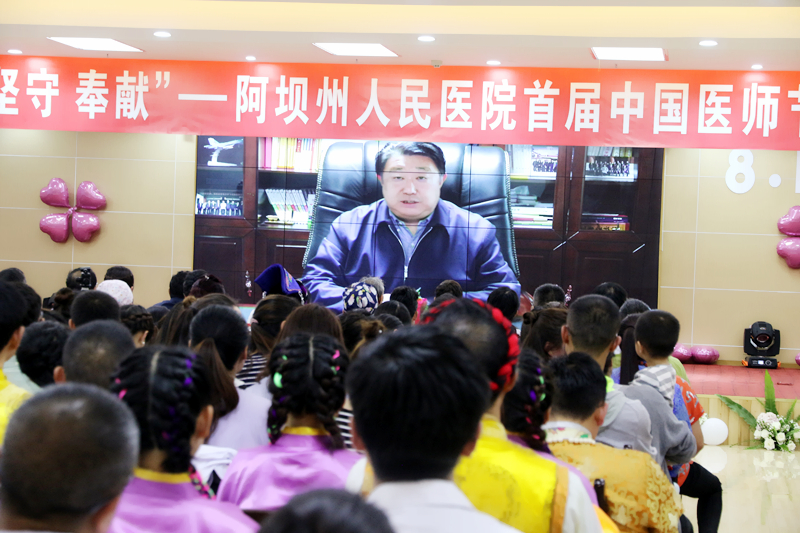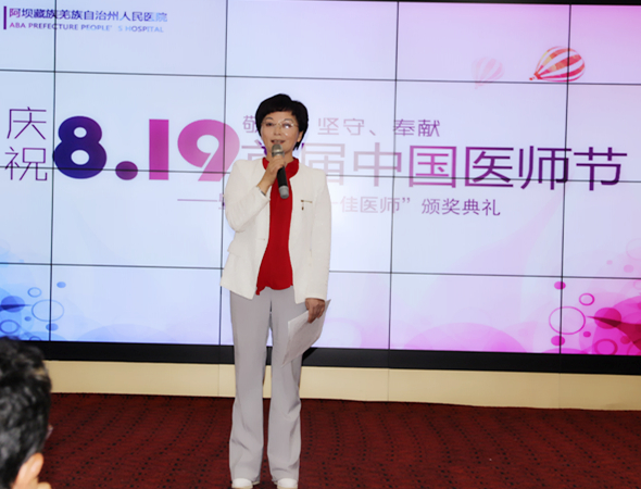 州政府欧阳梅副州长也在会场向全院医师致以了节日的问候并提出了殷切希望。欧州长首先肯定了医院近年来的发展成果并要求医师们修医德、行仁术,用先进的技术及优质的服务增进人民健康福祉,把州人民医院建设成为川甘青结合部医疗中心、为健康阿坝做出新的更大贡献。