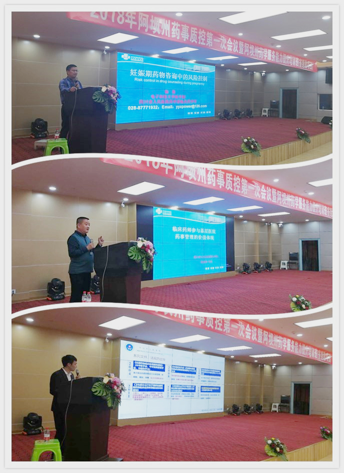 开幕式结束后,专题讲座正式开始。首先由四川大学华西医院张志勇主任、南充市中心医院临床药学科杨思芸主任、四川省人民医院临床药学科杨勇主任、彭州市人民医院药学部邹剑主任、四川省人民医院新津分院药剂科李加主任、阿坝州人民医院临床药师申平鑫分别对“基层医疗机构药事质量与安全管理”、“辅助用药的管理实践与探讨”、“妊娠期药物咨询的风险控制”、“侵袭性肺曲霉菌病诊治进展”、“临床药师参与基础医院药事管理的价值体现”、“抗菌药物的临床合理使用”进行生动讲解。