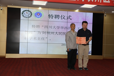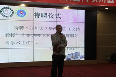 王文涛教授为大家讲解了《肝脏外科技术演进及肝包虫病治疗进展》,让各位同仁对肝脏外科手术技巧的演进更进一步的了解,让阿坝州各位同仁受益匪浅;在阿坝州人民医院门诊大楼前王文涛教授团队及喻定刚教授进行义诊,前对肝包虫病的现场手术操作,让我院肝胆外科医生获益良多;阿坝州人民医院党委书记、院长谷运麒为王文涛教授颁发特聘“王文涛教授为我院肝胆外科学术主任”证书,为我院肝胆外科长远发展提供了有力保障。