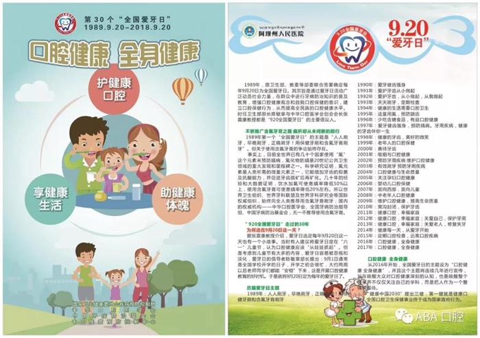 2018年9月20日是全国第30个“爱牙日”,今年宣传主题继续为:口腔健康 全身健康。增加副主题:护健康口腔,助健康体魄,享健康生活。旨在推进“健康中国2030目标”的实现,提升大众对口腔健康的关注,创建有利于口腔健康的环境。阿坝藏族羌族自治州人民医院口腔科组织开展了2018年“9.20爱牙日”活动。