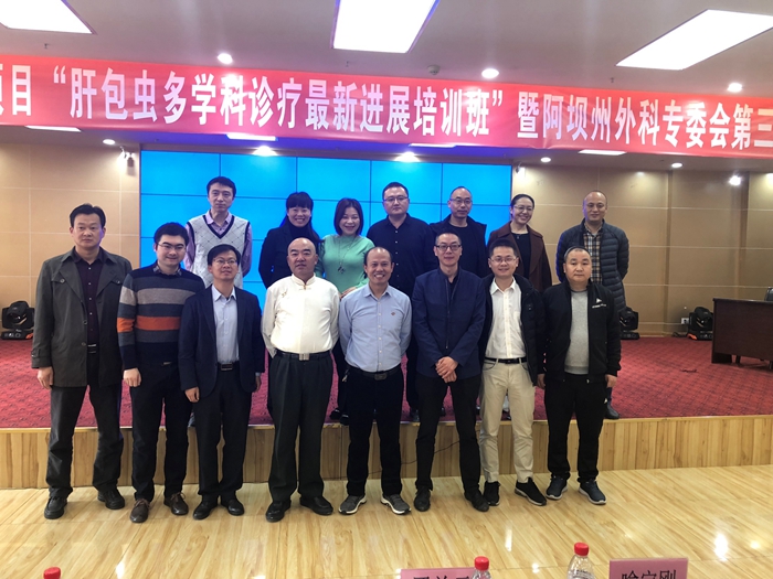 鉴于肝包虫病的复杂性和致病的多样性,肝包虫病的治疗需要个体化、多学科、综合治疗,已经逐渐成为共识,因此阿坝州人民医院于2018年10月27日-28日举办了省级继教项目“肝包虫病多学科诊疗最新进展培训班”,培训班邀请了包虫病临床治疗一线的专家教授介绍包虫病的多学科治疗进展,以提高阿坝州包虫病治疗的诊治水平。在杜刚副主任医师主持下,由阿坝州医学会外科专委会主任喻定刚教授致开幕辞,并代表医院对远道而来的四川省人民医院罗兰云教授莅临阿坝州人民医院指导工作表示热烈欢迎,同时热烈欢迎阿坝州的同道前来参加本次学术会议。喻教授言简意赅、深入浅出得说明了会议的重要性,并预祝大会取得圆满成功。罗兰云教授与阿坝州同仁合影留念后大会正式开始。