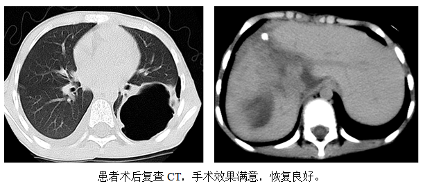 完善相关检查后,全麻下行肺包虫切除术+肝包虫外囊切除术,术中出血540ml,术中输悬浮红细胞3.5U。(主刀医师:杜刚 副主任医师)