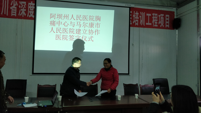 为进一步规范急性心肌梗死等急性胸痛患者的救治流程,促进院前、院内急救通道的紧密合作与无缝对接,不断提高区域内急性胸痛患者的救治水平和抢救成功率。2019年3月5日,杨林副院长代表我院与马尔康市人民医院唐远勤院长签署了胸痛中心战略合作协议。