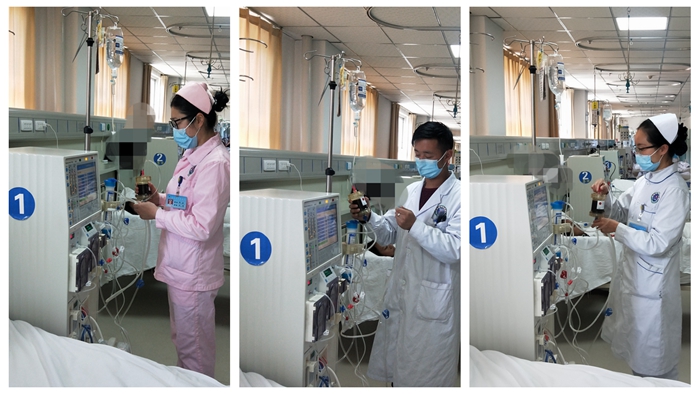 2019年3月14日,医院血液透析室护士长王维慧带领团队完成首例该项技术运用。在运用前,护士长首先对全科人员进行理论和操作培训,要求每个人务必熟练掌握此项杂合型、个性化的治疗模式。操作流程:把滤器预冲、管路链接,机器设置、抗凝操作、血压监测、血流速度到治疗结束撤滤器等等。培训结束后,对透析患者开展了首例HDF+HP新型治疗。透析期间,患者无任何不良反应。