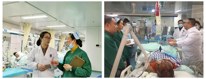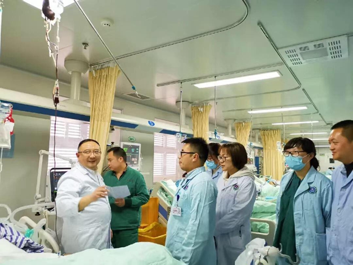 会后,黄晓波主任等一行专家来到州人民医院重症医学科临床一线,详细询问了科室包括收治患者的数量和主要种类、血液净化等技术的开展情况以及课题申报的现状等。黄晓波主任在患者床旁,根据患者病情,就重症创伤患者的管理,有创呼吸机的参数设置等具体问题对临床工作进行了指导。陆蓉护士长在床旁与护理人员进行了交流探讨,分享了自己的经验并按照重症护理规范予以了相应的指导。