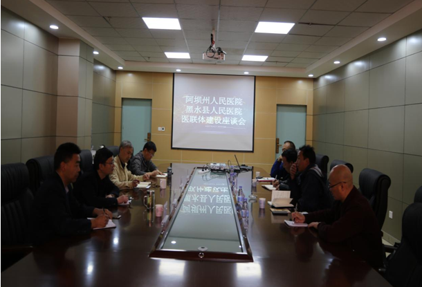 为进一步就医联体建设工作进行磋商,2019年4月26日上午,黑水县卫健局苏拉局长带领黑水县人民医院谢朗波院长、县疾控中心主任罗尔基、县卫生执法队队长朱军(挂职)一行4人来到州人民医院就医联体建设工作与州人民医院党委书记、院长谷运麒、副院长杨林及医务科蒲光军、翁世平进行座谈。