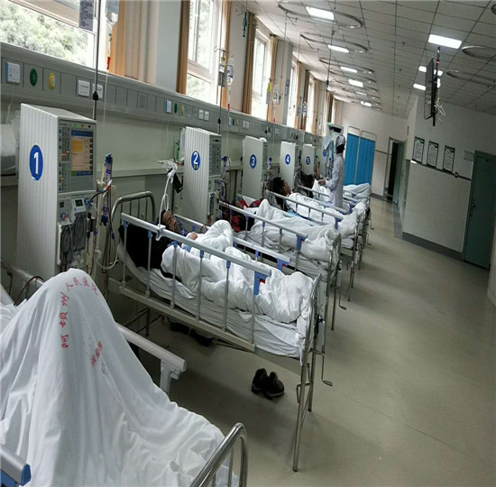 目前,血透室共有30余名透析患者,为了确保每一位病人每周3次的透析时间,她们将患者分为一三五,二四六两班透析。无论是寒冬还是酷暑,她们都没有节假日,每天医护人员都早早的来到血透室,做透析前的各项准备工作,确保7:00病人陆陆续续上机透析。有些病人是独自来的没有家人陪伴,当他们渴了饿了,血透室护士就成了他们的家人,热心地为他们热饭、倒水,有时还要帮助一些特殊老年人处理大小便。