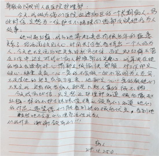 5月8日,收到来自病员的感谢信,感谢多年来血透护士对此的付出和关心,在以后的工作中,我们将继续努力,不断提高护理服务质量水平,为患者提供更优质的护理服务。