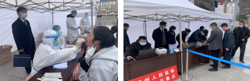 会后,按照省、州、市疫情防控指挥部及4月5日我院疫情防控工作会精神“严格执行落地后再进行一次核酸检测”的要求,严格落实“外防输入、内防蔓延、动态清零”总体要求,有效控制和降低疫情传播风险,医院党委迅速反应立即组织医务、护理、总务、网络、保卫、院感等职能科室启动便民核酸采集点,院党委书记潘华、副院长刘志红和相关职能科室负责人现场督导核酸采样点设置和采样工作推进。大家紧密协作,仅用1个半小时内完成了临时核酸采样点(州医院大桥)条码打印帐篷、核酸采样帐篷、网络、电路、一米线、警戒线等一系列的准备工作。12:00,便民核酸采样点工作有效启动,截止4月5日下午15:00点,采样达400余人次。