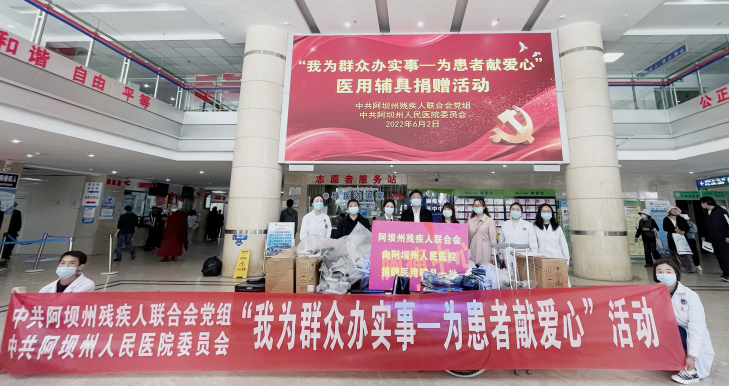 2022年6月2日上午,州残疾人联合会党组和州人民医院党委在阿坝州人民医院门诊大厅开展了“我为群众办实事—为患者献爱心”活动。