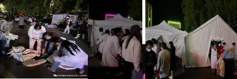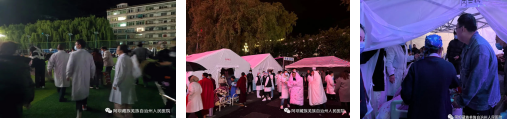 副院长刘义芳组织后勤总务人员开通应急通道,准备应急物资,对全院房屋安全、水电安全、消防安全、电梯安全等逐一进行排查,立即为院内疏散点搭建临时帐篷,在场医护人员和家属共同帮助搭建,30分钟内搭好了8个帐篷,危重患者安全转移至帐篷内。