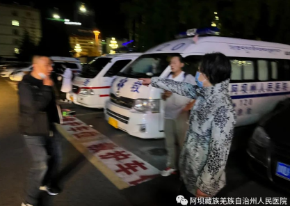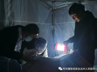 随后,重症医学科护士周珍菲随同满载急救物资的救护车前往震中继续增援。余震不断,在相邻县灾情不明的情况下,为保障灾区人民生命安全,医院随即再次组织医护骨干:骨科主治医师宿瑞强、主管护师兰静同阿坝州卫健委应急科科长钱晓强在02时24分前往红原县支援。