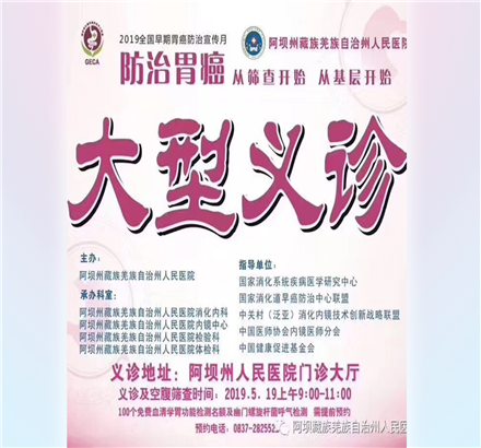 5月为全国早期胃癌防治宣传月,5月19日这天早上,雨后的大马市,天空霎时变得湛蓝湛蓝的,空气也变得格外清新,关于“防治胃癌,从筛查做起,从基层做起”的大型义诊活动也在阿坝州人民医院门诊大厅拉开了帷幕。
