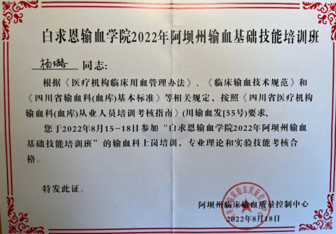 为响应“健康中国”战略,巩固拓展脱贫攻坚成果,全面推进健康乡村建设,促进优质医疗资源下沉,提高基层医疗卫生服务水平,阿坝州临床输血质控中心于2022年8月15—19日在州人民医院举办了“白求恩输血学院阿坝州输血基础技能培训班”。
