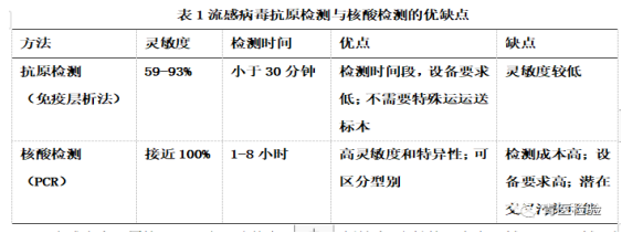 流感病毒的检测方法主要包括病毒分离培养、抗原检测及核酸检测等。流感病毒的分离培养作为传统的金标准是研究病毒抗原性、遗传变异特征和疫苗制备过程中不可缺少的重要手段和方法,但是由于操作复杂、检测时间久,很难在临床展开。目前,最常用的是快速抗原检测和核酸检测,优缺点比较见表1。