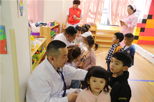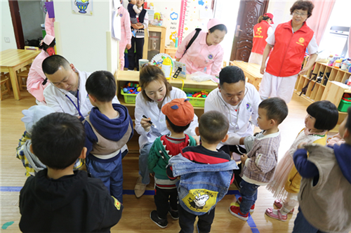 最后由外科支部党员、儿科医生杨家伟和儿科医生谢新权、张芳霞为幼儿园小班的每个小朋友做体检,党办主任蒋晓梅帮助小朋友们排队检查。医生们仔细检查了小朋友们的身体状况,经检查,小朋友们都发育良好,身体健康。