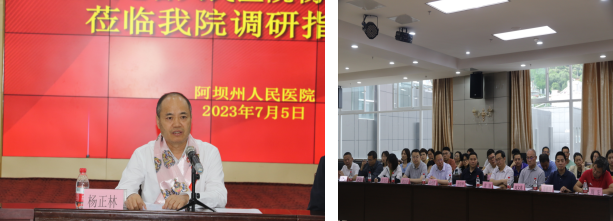 中科院院士、四川省人民医院院长杨正林对我院快速发展和取得的成绩给予了肯定,并提出指导意见。他强调,当下正值全国认真学习贯彻习近平新时代中国特色社会主义思想主题教育阶段,此行也是省人民医院落实主题教育思想具体内容之一。按照省委、省政府统一部署对口帮扶阿坝州、阿坝州人民医院,在阿坝州委、州政府的大力支持下,省人民医院将和州医院建立集中帮扶长效机制,结合医院打造川、甘、青三省结合部医疗中心、疑难危重症救治中心的发展战略目标,继续加大在人才培育引进、专科建设、服务能力提升等方面的帮扶力度,以托管帮扶为契机,同行共进,在全省范围内打造具有行业影响力、社会影响力的托管帮扶典范,帮助医院全面提质增效,推动医院发展再上新台阶。
