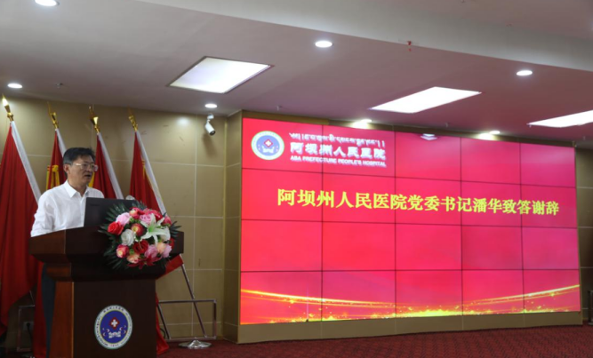 医院党委书记潘华致答谢辞,并向何处长一行介绍了阿坝州人民医院基本情况,潘华书记表示:我们将用好这批仪器设备,使其发挥最大的社会效益,为广大人民群众解除病痛,不辜负上级领导和社会各界对我们的支持和厚望。希望国家卫生健康委和各爱心企业一如既往地关心支持民族地区卫生事业的发展,经常莅临我院指导工作,并提出宝贵的意见。