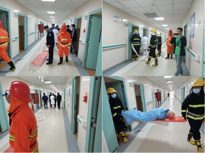 首先,在消防逃生灭火疏散演练过程中,监控室通过消防控制主机烟感报警触发报警,消防控制室收到报警信号后,立即拨打10楼护士站电话前去查看核实,并用对讲机呼叫巡逻保安前去查看,在护士站传递该楼层病房着火属实后,监控室立即报告总值班并启动应急预案,立即组织科室医护人员、微型消防站人员到火场进行有序疏散患者和灭火处置,安保人员迅速连接消火栓,使用灭火器灭火,通过科室和微型消防站的积极处置,火势被快速扑灭,将被困人员救出送到急诊科进行治疗。