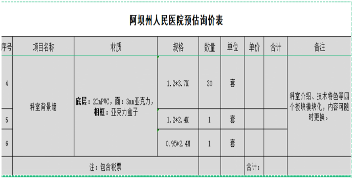 阿坝州人民医院本着公正、公平、公开的原则,拟对阿坝藏族羌族自治州人民医院科室背景墙项目进行比选,欢迎符合本次比选要求的供应商参加。