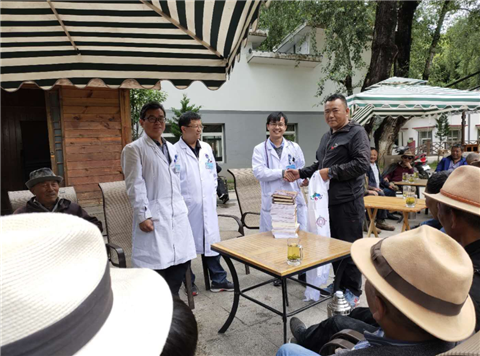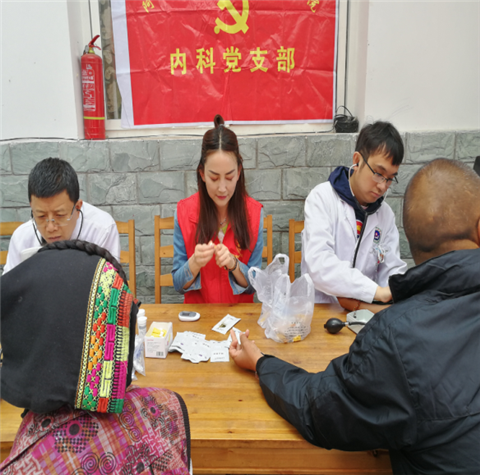 第二项内容为当地居民行健康义诊活动,医护人员询问来参加义诊群众相关病症,行血压检查及血糖检测,给予初步诊断,并发放相关药物,对少数血压较高、血糖较高群众建议来我院继续住院治疗。