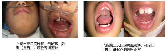 口腔科张志强、邓崇阳医师和专科医生评估患者病情后,考虑患儿插管、麻醉、手术、气管切开中存在的风险及并发症,在充足补液后2小时后局麻心电监护下行口底脓肿切开引流手术,实施微创小切口多通道引流技术及三黄散湿敷局部中药技术。患儿的坚持、家属的信任、医护团队的协作,手术很成功,耗时半小时,双侧及口底正中均充分引流,灰褐色脓液通畅流出,术后气道压迫明显解除。术后第一天,患儿进食通畅,呼吸顺畅,口底肿胀较之前明显好转,请临床药师指导用药;术后第二天,张口正常,病灶牙(六龄牙)开髓、拔髓、扩挫、根管预备;术后第三天,拔除患者前牙区多生牙;术后第四天,复查患儿各项生命体征平稳,康复出院,后期继续46牙根管治疗。1月10日,患儿康复出院。