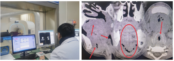 1月6日上午11时,张朝秀医师(曾于阿坝州人民医院口腔科实习)及时把病情及转诊事宜对接阿坝州人民医院口腔科江蓉主任医师、张志强主治医师、邓崇阳住院医师,做好接洽准备。经过4个多小时的绿色生命通道奔驰,下午15时,患儿由120救护车送达州人民医院,急诊科立即给予吸氧、生命体征监测及全身生命支持,急诊完善相关实验室及影像学检查,检验提示各项炎症指标较高,影像提示气道压迫,脓肿形成。立即收治患儿入住口腔分病区,入院后请麻醉科、耳鼻喉科会诊,协助评估患儿情况,综合科护理团队提供I级护理,做好患儿急诊术前准备。